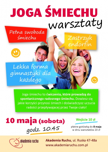 JOGA ŚMIECHU WARSZTATY – spotkanie wakacyjne Termin: 12 lipca 2014, godz. 10:45 Zapraszamy na warsztaty z jogi śmiechu, gdzie każdy może śmiać się bez ograniczeń. Będziemy wykonywać ćwiczenia, które prowadzą do spontanicznego radosnego śmiechu. Dowiesz się co to jest joga śmiechu, jakie korzyści przynosi śmiech i jak poradzić sobie ze zbyt dużą ilością powagi. Doświadczysz uczucia radości przepływajacej przez […]